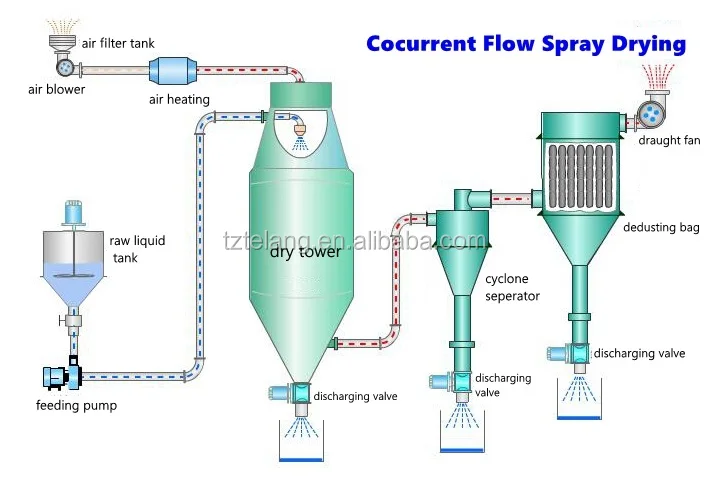 After filtering and heating, the air would enter into upper air-deployer of drying tower, and then come in in hot spiral form. At the same time, the raw liquid material would be atomized by tower from upper inside, become the super tiny globule in mist type, the surface of which would contact the hot air fully, then finished dry powder would be achieved in short time and collected at the bottom of tower and be discharged from cyclone separator, the gas would be exhausted outside.