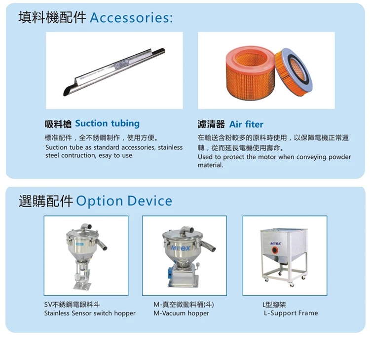 MITEX MVL series sandard separate vacuum hopper loaders are suitable for conveying material over long distance. All models adopt stainless steel hopper to ensure no contamination to raw material. High efficiency high pressure blower features light weighted, durable, great suction power, easy installation and operation. |