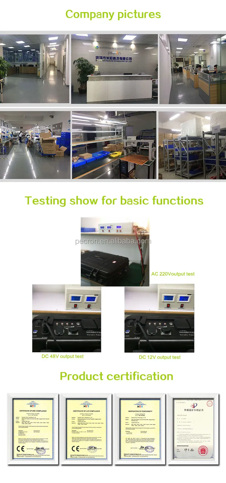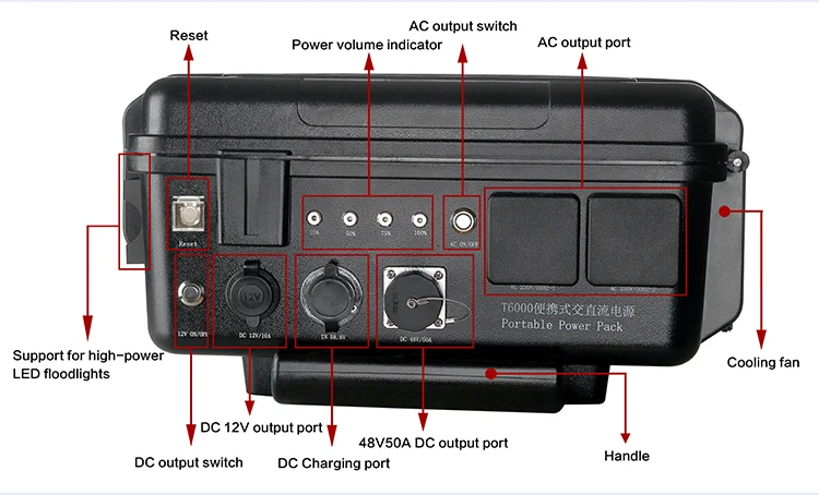 PECRON-T6000 is a portable solar power station - aslo a AC/DC power station with built-in lithium battery, which is designed with the safe lithium-ion battery and inverter technology. It’s very easy to carry and convenient offering power to electrical appliances with advantages of light weight, large capacity , high power and multiple functions; It’s with capacity of 51.8V109.2AH/5656WH. The followings are its main functions: