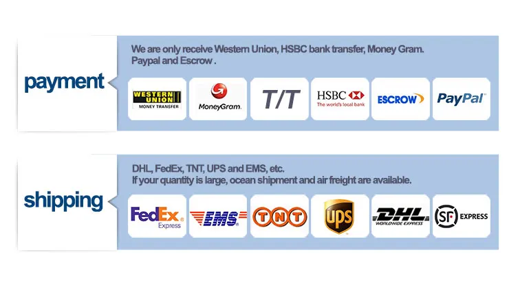 | Shipment: | DHL,UPS,EMS,Hongkong post; | Payment: | Western Union ,T T,Paypal,MoneyGram; |