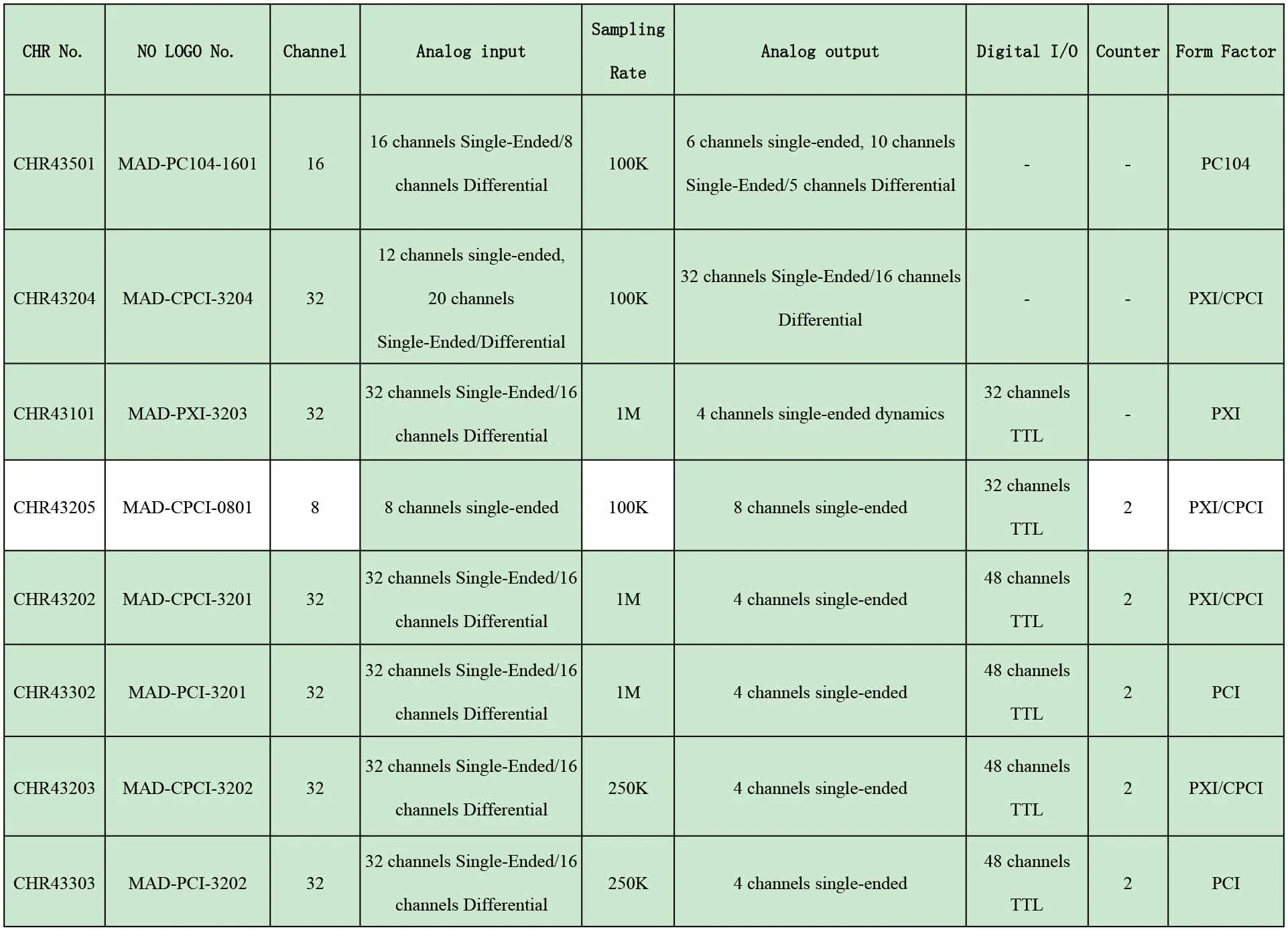 CHR offer customized multi-function data acquisition cards with analog input function, analog output function, digital I/O function and counter function configurable according to projects’ requirements. CHR’s multi-function data acquisition cards are widely used in automatic test system construction, data acquisition and recording system and control simulation system development.. CHR43203/43303 is are multi-function data acquisition card including analog input, analog output, TTL digital input and output, timing counter. Their powerful function can meet different requirements of industrial measurement and automation control, and their good compatibility is applicable to various system configurations.