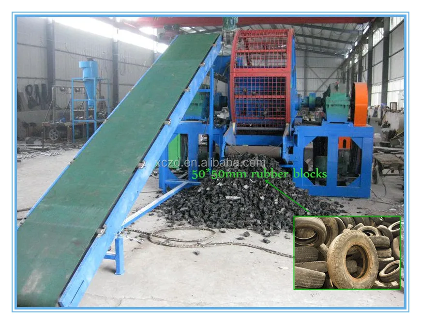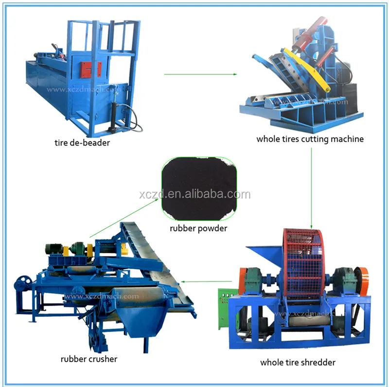 Waste tire - Tire wire drawing machine - whole tire cutting - tire shredding - Tire crushing - magnetic separator - fiber separator - Rubber powder