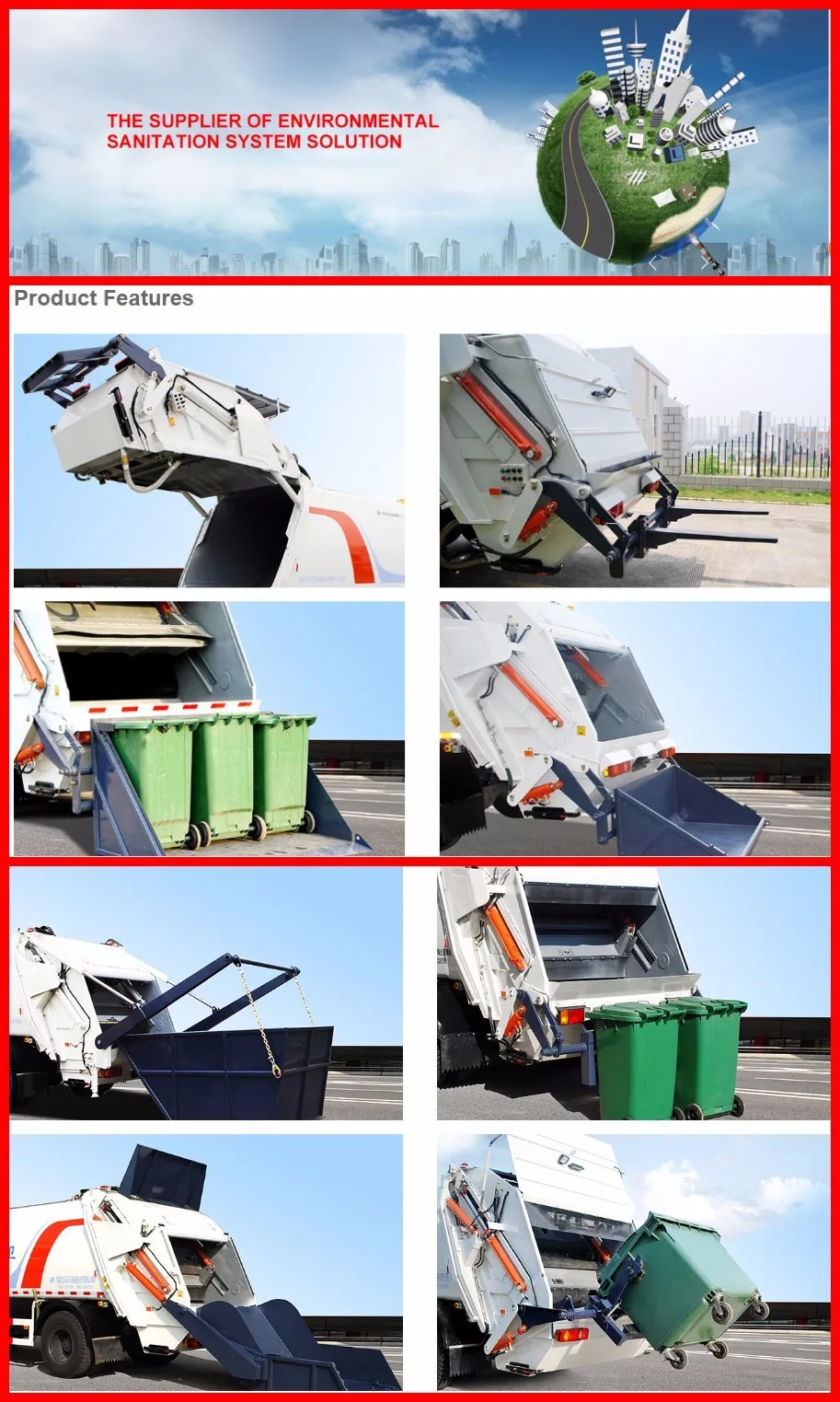 | Equipment | Equipped with dustbin, hydraulic system and operating system Equipped with two advanced double acting hydrocylinders One vehicle can cooperate with several dustbins to improve the ability of cycle operation.cycling time60s | |