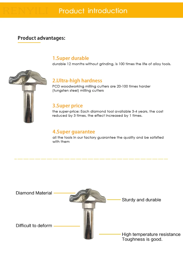 | material: | PCD diamond; | Packaging Detail: | RENYILI Carbide Woodworking 50-150mm Diamond Milling Cutter Packing: plastic box packing specifications: length 5/8"*, width 5/8"*, high 4", one set; |
