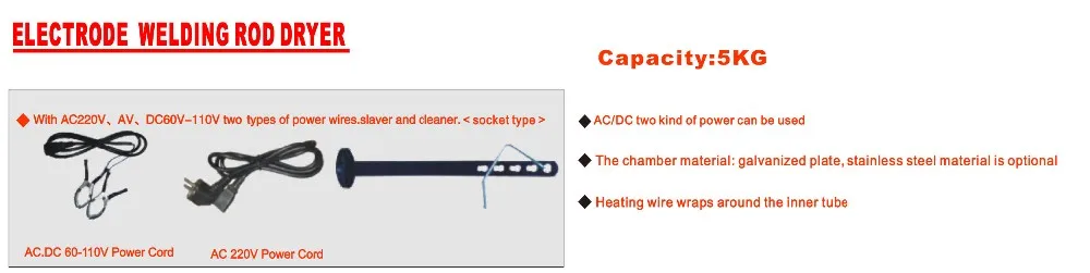 This electric oven TRB-5E weigh only 3 kg empty, it is the lightest portable electrode holdiing electric oven on the market.It is high portablility and light weight to easy transporting this portable oven using bracket.This TRB-5E has all-in-one lid and rod elevator, which could load and unload easily electrode while in the field.The small 5 kg capacity is suitable for half day shift, then have lunch break and fill up for the rest of the day.