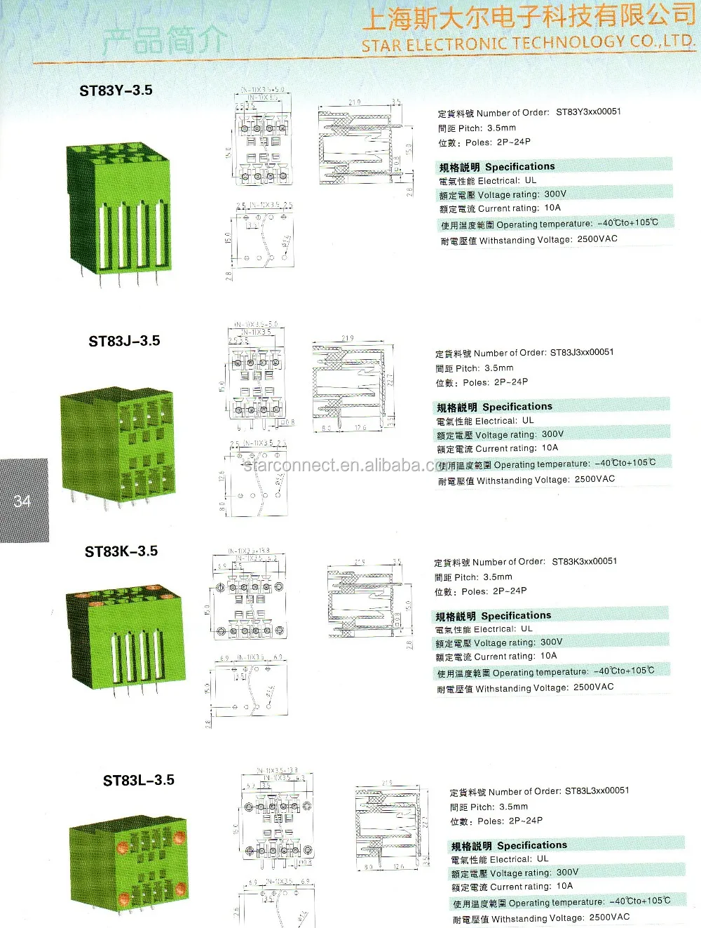| Rated voltage: | 300V PCB Mount Screw Terminal Block; | Wire Range: | 24-12AWG PCB Mount Screw Terminal Block; |