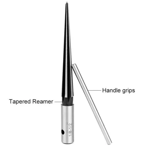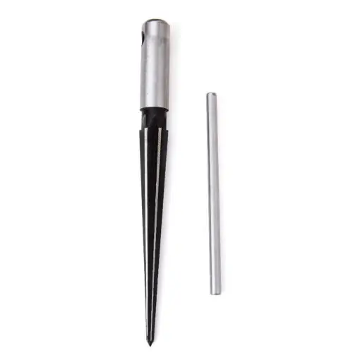 The 5-degree 6 fluted reamer tapers from approximately 1/8"""" to 1/2"""", with 3"""" fluted cutting length. Made of hardened carbon steel and ground steel edge’s. It works for Vintage-style pins, as well as modern Martin Bridge pins.