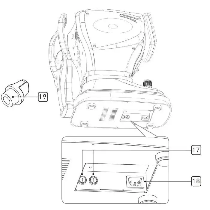 18.Power inlet: Connect ~220V, 50Hz AC.