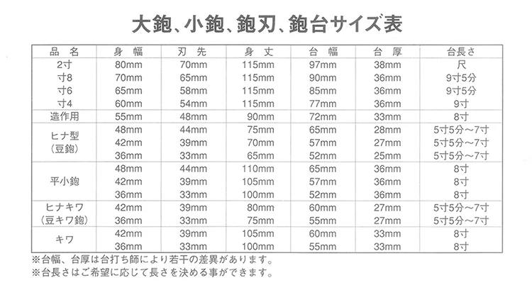 | Japanese description | Sun-8 | Sun-6 | Sun-4 | 2-Sun | Small (Block) Plane(Kanna) | ||||||||||||||||||||||||||||