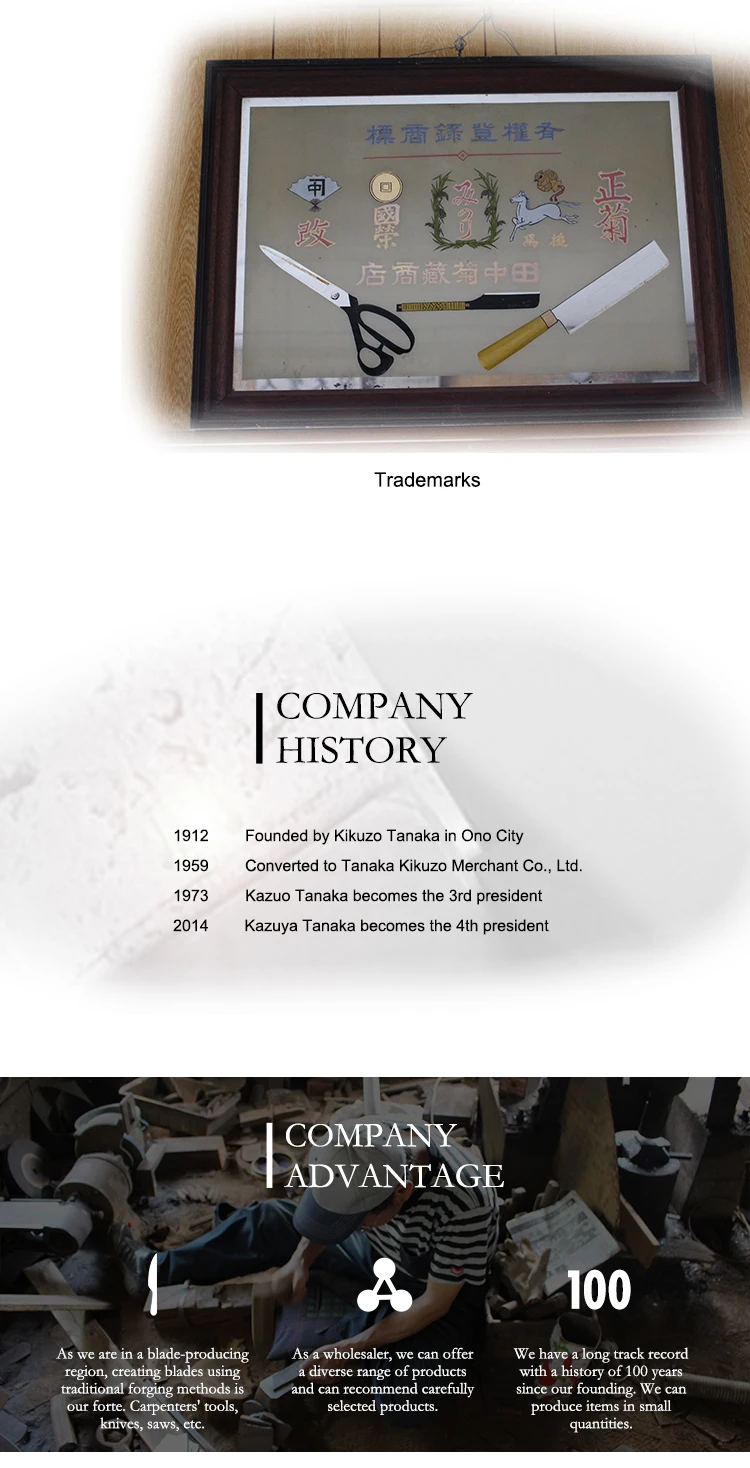 Since our company's founding in 1912, we have developed into a wholesale merchant handling all sorts of metal goods from our location in Ono city and Miki city, Hyogo prefecture, an area nationally renowned for producing metal goods and abacuses.
