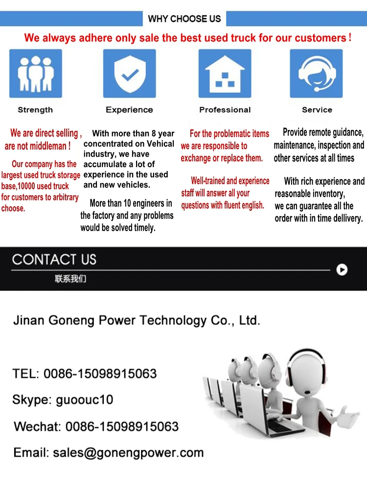 every truck we deliver to our customers should pass the early stage “used truck optimum selection,key component detection and replacement”,before delivery “all round debugging of trucks, comprehensive inspection of trucks”and so on. strive to deliver to customers every export of used truck and used constructionmachinery are up to high quality standards.