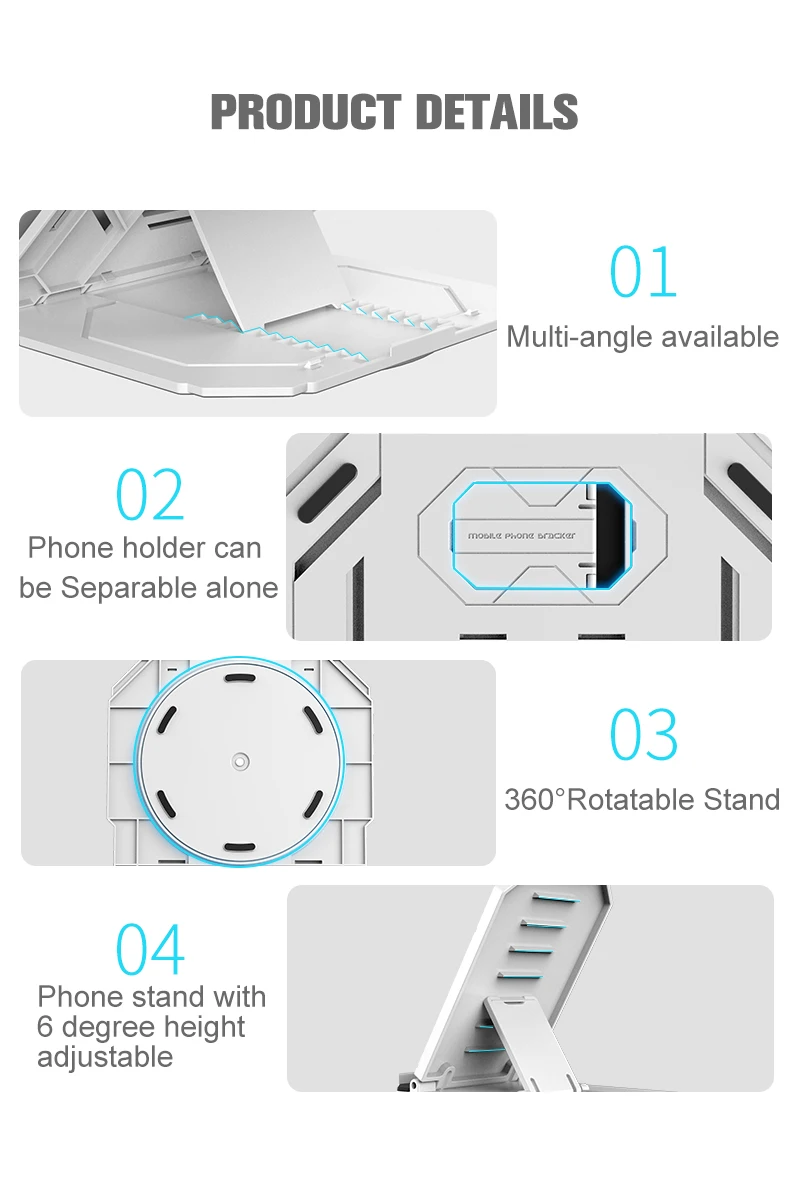 • Two-in-one laptop stand with multi-angles and 360°rotation at bottom.