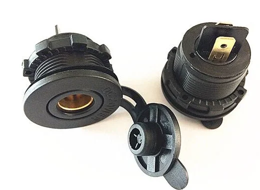 The socket mounts with a retaining nut against a panel. Uses standard 0.250 quick connects. Can be used with any 12 volt style plug.