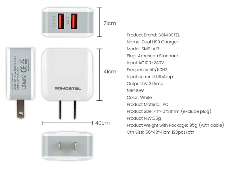 | Packaging Detail: | [Somostel] A13 new trending products China factory OEM ODM 2 usb charger cargadores de celular for iphone x xr cargadores de celular; | Color: | White; |