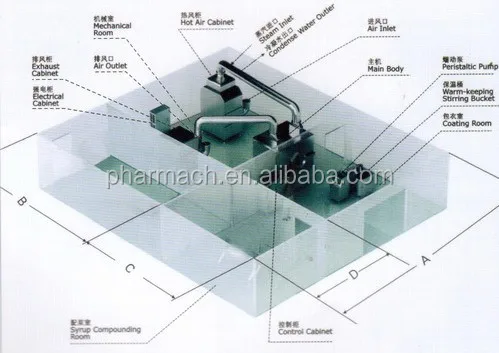 The tablets make complicated and constant track movement with easy and smooth turn frequent exchanging in a clean and closed drum of the film coating machine. The coating mixed round in the mixing drum are sprayed on tables through the spray gun at the Inlet un action of the peristaltic pump. Meanwhile under the action of air exhaust and negative pressure 100,000 clean hot air supplied by the air exhaust cabinet is exhausted from the fan at the sieve meshes through tablets. So these coating mediums on the surface of tablets get dry forming a coat of firm, fine and smooth film. The whole process is finished under the control of PLC.
