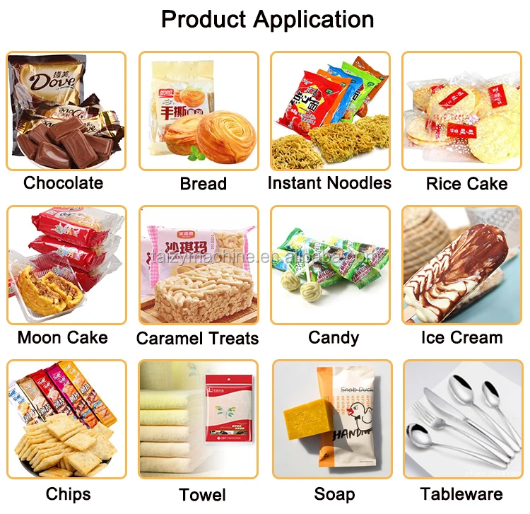 snacks packing machine is suitable for the packaging of various solid and regular objects such as biscuits, bread, instant noodles, moon cakes, candy, chocolate, medicines, daily necessities, hardware parts, cartons or trays. Widely used in food, pharmaceutical, hardware, daily chemical and other industries, can automatically complete the whole process of feeding, bag making, sealing, printing batch number, finished product output, counting, etc.