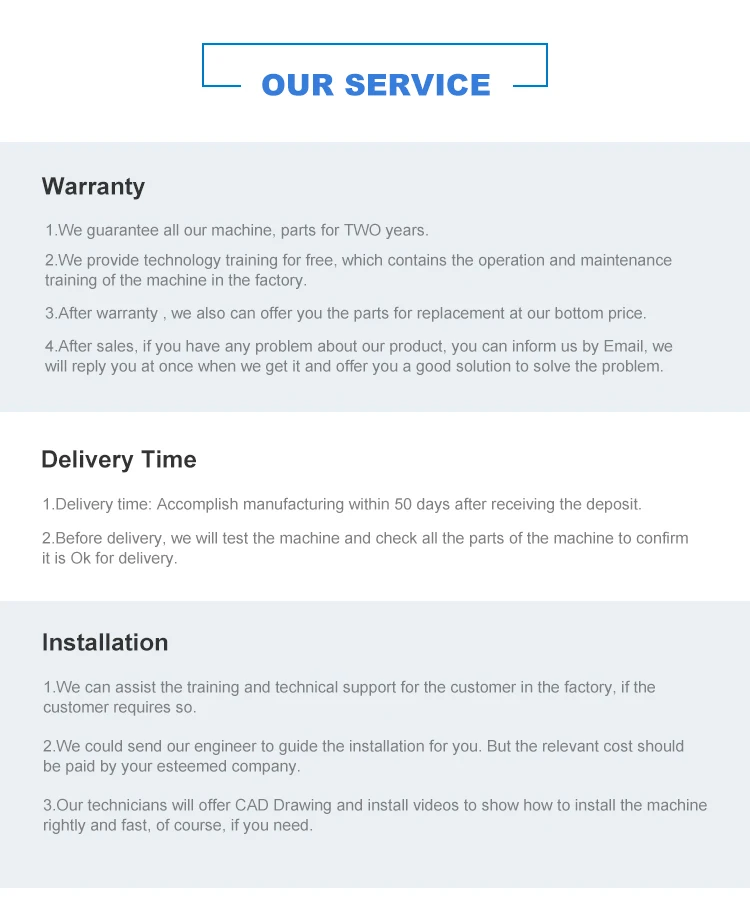 A3: We will arrange our professional technical to go aboard to your factory, they will help you and teach you how to install and maintenance the machines which you purchased. Or help you to fix machine when it has problems.