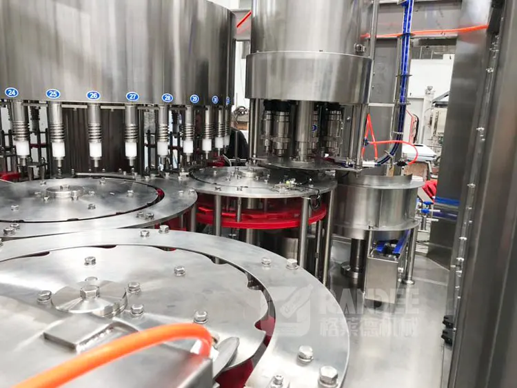 (2)The water filling machine is mainly used in the beverage filling operations. The three functions of bottle wash, fill and seal are composed in one body of the machine. The whole process is automatic.