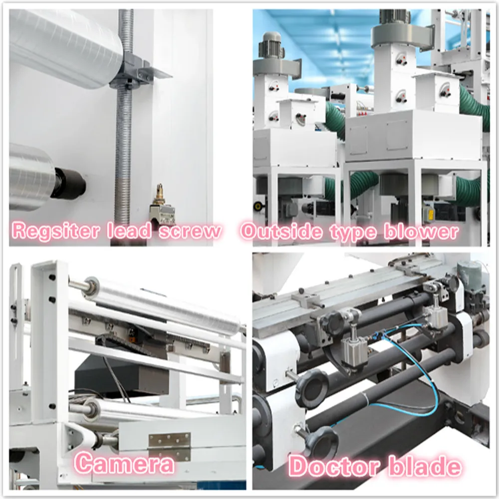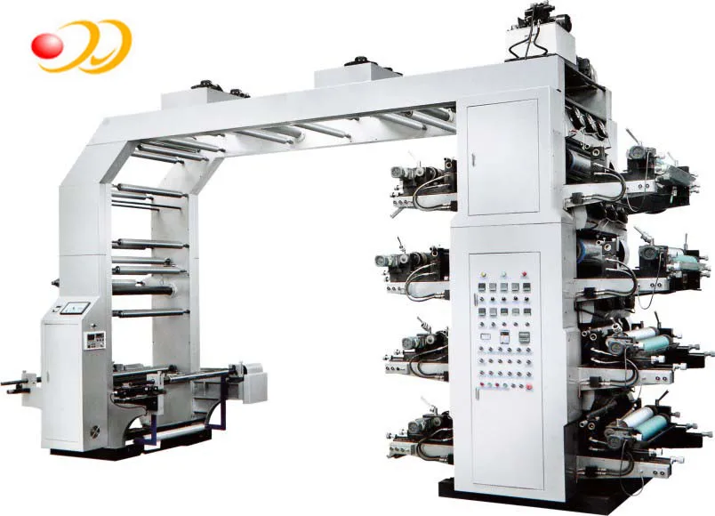 The machine is used for bopp , pet , pvc ,cpp , pc , the same nature complex film and paper . Its printing speed is 80-100m/min, while the mechanical speed is 120m/min.The machine adopts air cylinder, pulling the core shaft to install the plate.The drying is equipped with the centrifugal fan on the external frame to blow the absorption of heat recycling wind system and the tempeature is controlled by intelligent temperature controller to save electricity and strengthen the drying function.
