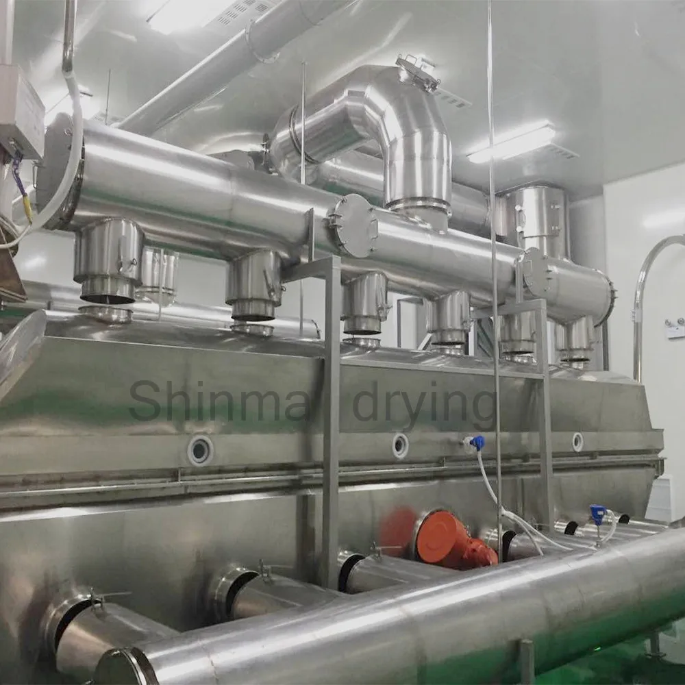 Vibrating fluid bed dryer is widely used for operation of drying, cooling and damp increasing (or carry out at the same time) for powder or granule materials. Material is fed into the machine from feeding inlet, and moves forward continuously along with the level of fluid bed under the action of vibration force. Hot air passes through fluid bed and carries out heat exchanging with damp material. Then the damp air is exhausted out by exhaust fan, some fine powder is collected by cyclone separator and dust remover, and dried product is discharged from discharging outlet.