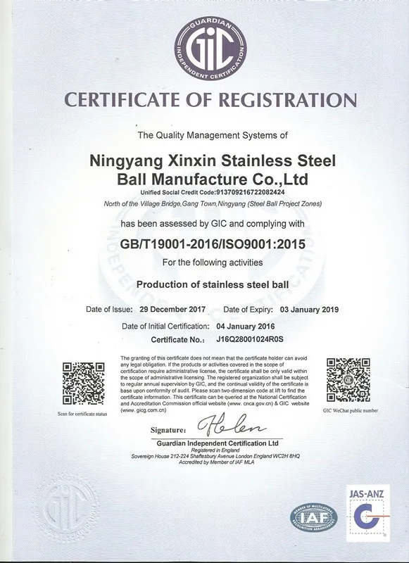 Tai'an XINXIN import & export CO,.LTD.mainly produce stainless steel balls(440C,304,316L,420,430), we also produce carbon steel balls(1015,1045,1085), bearing steel balls(GCR15),copper balls, glass balls, titanium balls, flying saucer balls, polishing balls and other kinds of hard alloy balls. The product specification is complete. We produce according to the GB308-2002 standard and measure up to the international standard of ISO3290-1998,AFMBA1989 and DIN5401-93. We have the ability to provide many kinds of steel balls which accuracy range is level G10-level G1000.