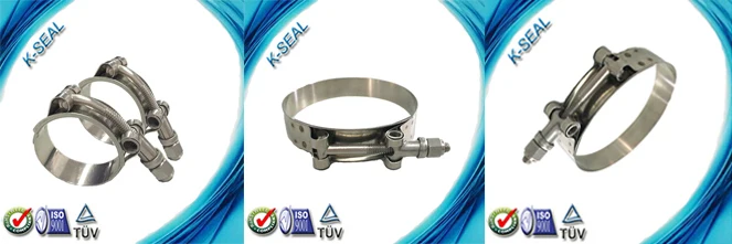 5) T-Bolt Clamp: K-Seal T-Bolt clamps are designed to provide connections without leaks. Band edges are rounded to protect the hose. It’s manufactured to the highest quality standards. This high strength clamp is often used for industrial, marine and vehicle.