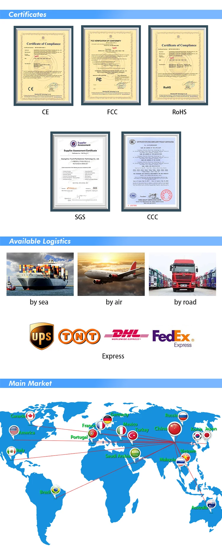 Guangzhou Touch-pie Electronic Technology Co. Ltd is an ISO 9001:2015-certified touch technology company supported by the state. With a production base of 10,000 square meters, we can ensure 10.1-inch to 98-inch touch screen all-in-one PC, desktops and all in ones development and large-scale production capacity. All the product models have been proved by the CE, FCC, RoHS and CCC certificates.