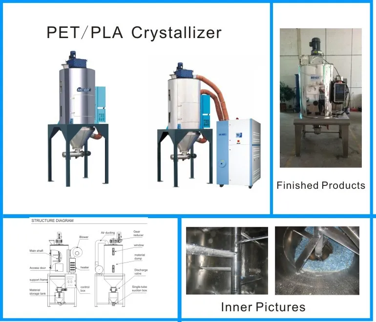 MCR closed-loop crystallizers are used for constant crystallizeation of uncrystallized PET regrinds or pellets, Processed materials can then be dried and dehumidified directly. Crystallized materials can be conveyed to material storage bin or into drying hopper. |