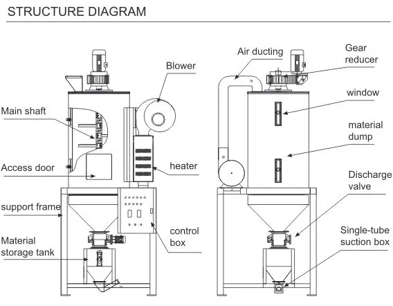 Materials can be dried under high temperature by using standard hopper.