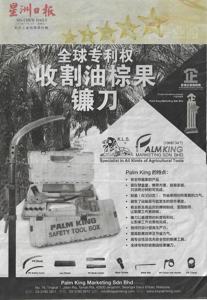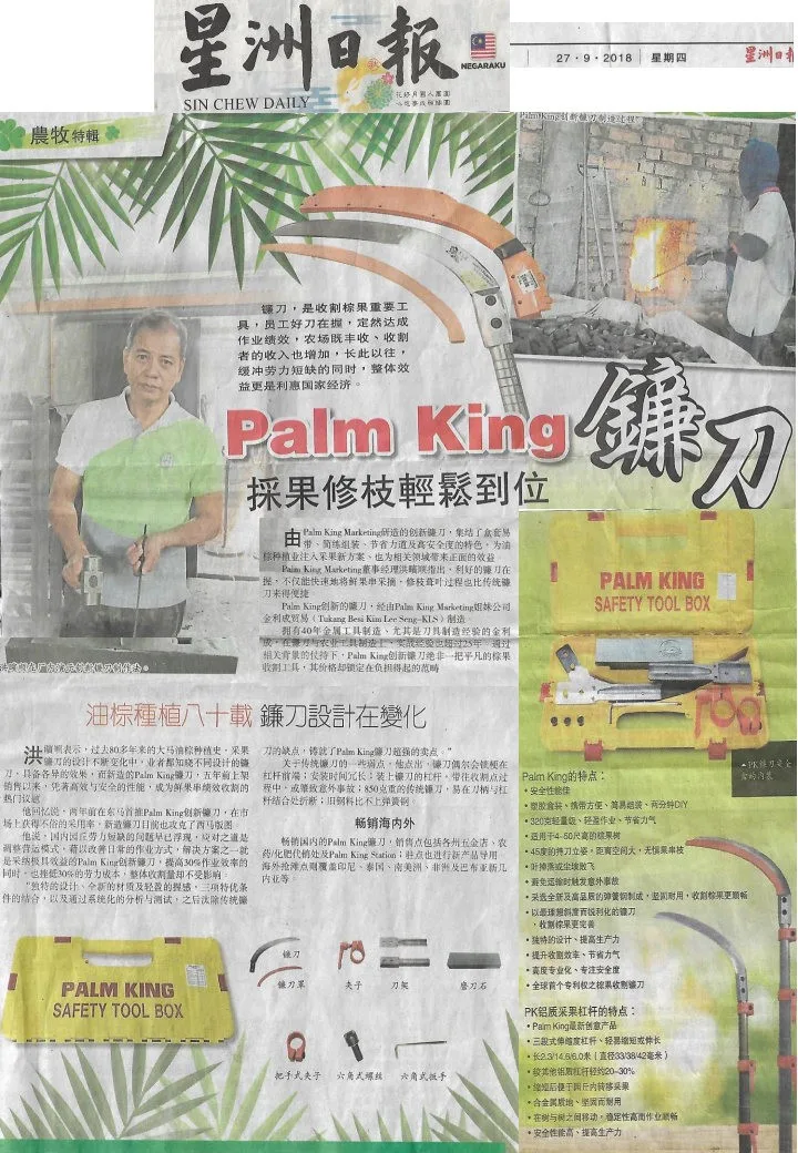 PALM KING MARKETING SDN BHD is a comprehensive agriculture tools marketing company based in Selangor, Malaysia. Over the past 40 years, we have found our niche and focus on offering innovative agriculture tool solutions to help businesses like yours to smoothen the process of harvesting for palm oil and provide safety harvesting for the workers.