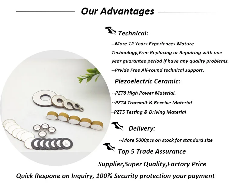Application: for ultrasonic cleaner,ultrasonic welding,ultrasonic distance measure sensor,ultrasonic detector,ultrasonic dental unit. Ultrasonic Beauty. ultrasonic motor,ultrasonic transformer and other high-power emanant transducers.