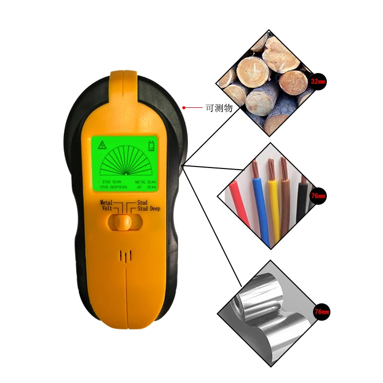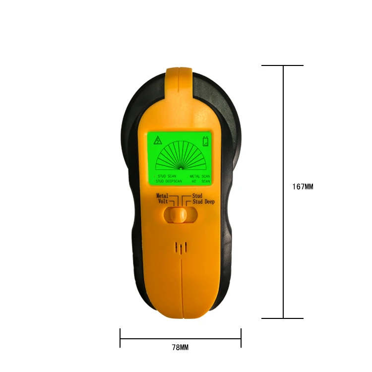 | Specification | * Detect wood and metal stud up to 1 1/4 in (32mm) * Detect metal rebar up to 3 in (76mm) * Detect AC live wire up to 3 in (76mm) * Auto calibration metal, voltage, stud detection * Operated by a 6F22 9V battery (not included) |