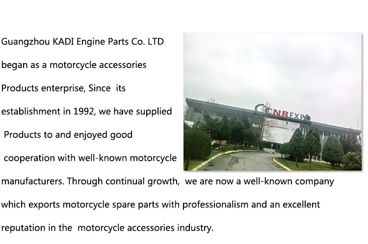 Guangzhou KADI engine parts Co.,LTD is one of the biggest motorcycle parts company in Guangzhou, only supply high quality motorcycle parts. We have rich resource and experience, can provide various motorcycle parts. Also, we are pride that we have a professional and serious team, most of our purchasing staff, technicist, and salesman have more than 5 years on motorcycle and motorcycle parts, even some staff have 20 years experience, and they are very seriously! As a motorcycle parts company, we have more than 100000 different products.Now, KADI is a very famous brand in many countries and regions, we hope more and more people can join with us, welcome to KADI!