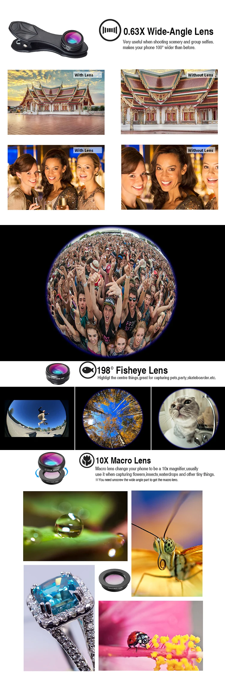 | Can be detachable: | Yes; | Lens Type: | 18x Telescope lens+0.63x wide angle+198 fish eye lens+15x Macro lens; |