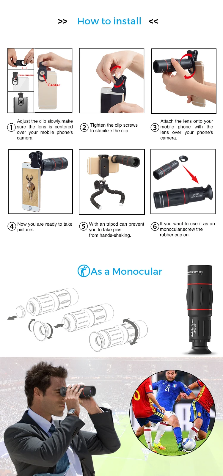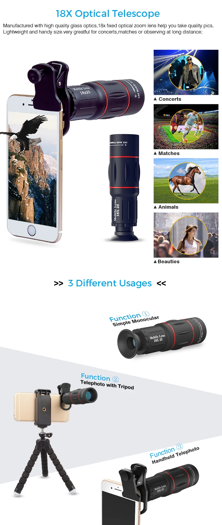 | Type: | Zoom Lens; | Package Type: | 18x optical zoom telescope lens for mobile phone 1pc/color box 50pcs/ctn; |