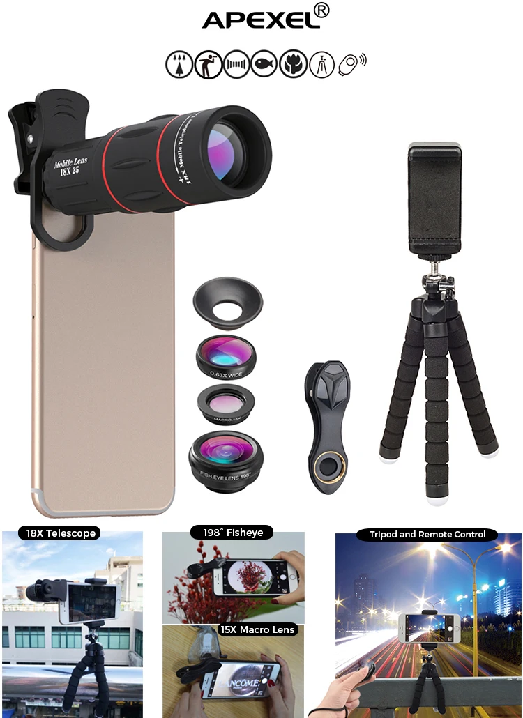 Amazon Top Seller 2019 APEXEL Mobile Camera Lens Universal Clip 18x Optical Zoom Telescope Lens for Mobile Phone