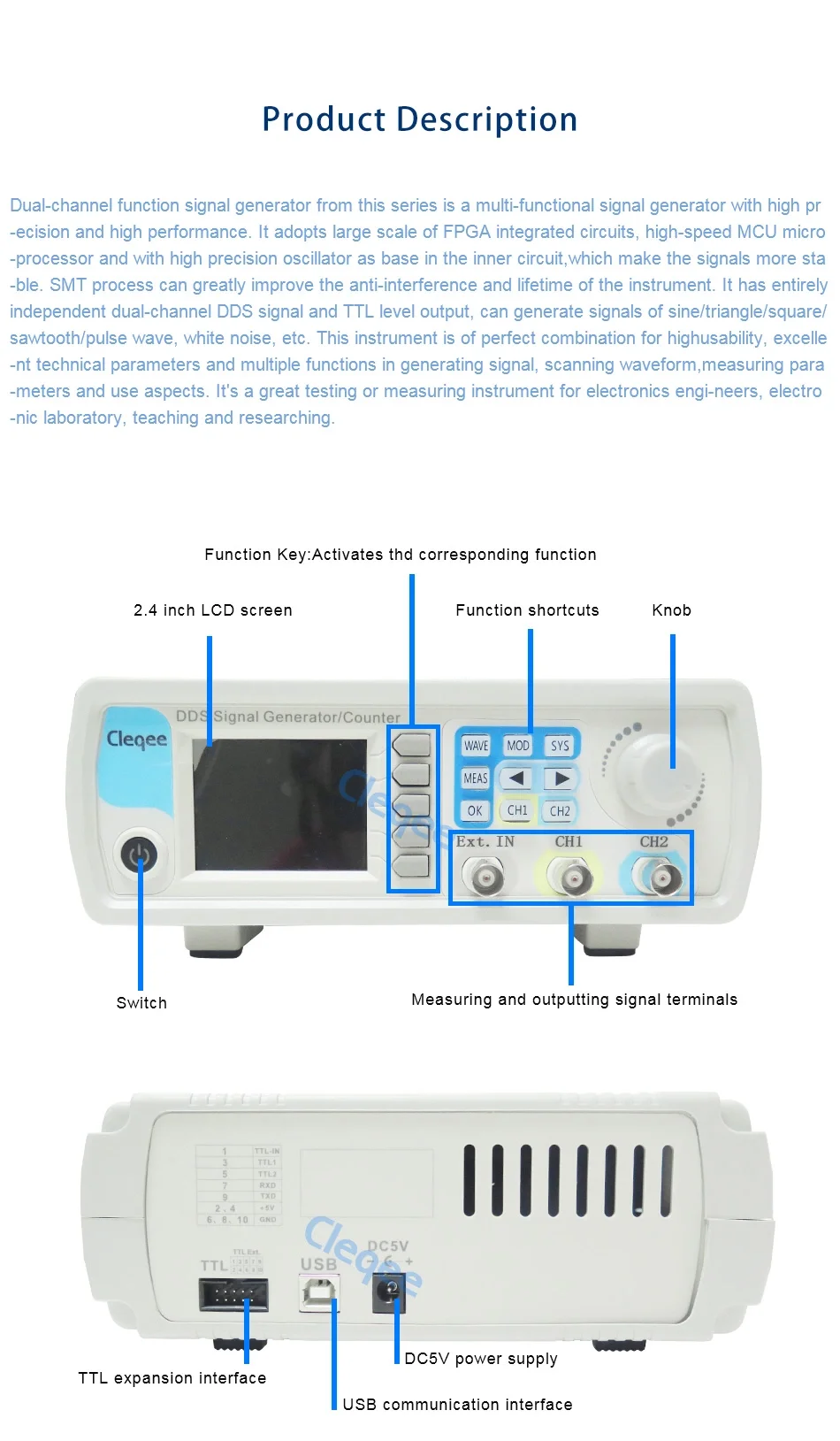 Dual-channel function signal generator has entirely independent dual-channel DDS signal and TTL level output, can generate signals of sine/triangle/square/sawtooth/pulse wave, white noise, etc.It's a great testing or measuring instrument for electronics engineers, electronic laboratory, teaching and researching.