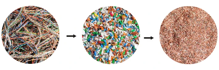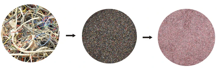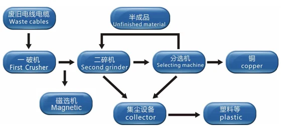 This whole system is consist of belt conveyor,crusher,screw conveyor,separator,blower,dust collector and control cabinet which can be used to recycle the copper granules from waste copper.
