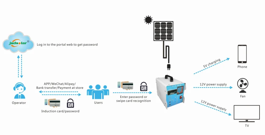This leasing type integrated photovoltaic energy storage machine is manufactured by Jinsdon Lighting. This system can provide a low-cost and long-term benefits solar power supply service to operator's customer group. This product is equipped with high-efficiency solar panel, LiFePO4 battery, 12V DC port, and 5V USB Mobile phone charging interface, having two kinds of password payment methods: by card and by key, convenient use, low operating cost.
