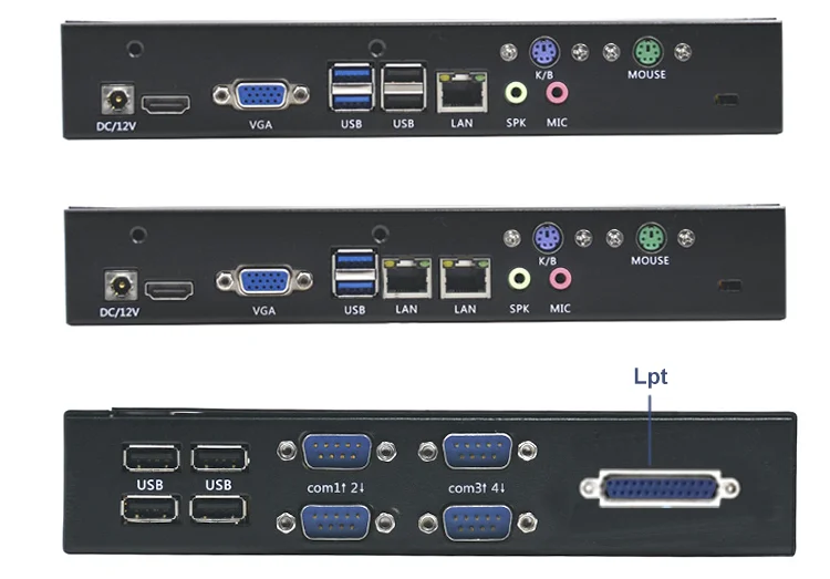 6.Interface:The common design has 1*Com port,1*Lan port,4*USB2.0,2*USB3.0.We can OEM or ODM,so,the interface can be:4*com port(or 6*Com port),the Lpt port alse can be added.if you need OEM/ODM,please contact us.