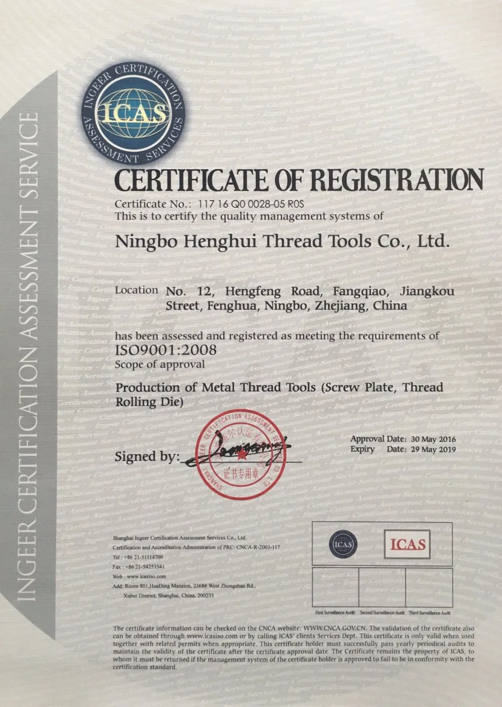 Ningbo Henghui Thread Tools Co., Ltd locates in No. 12, Hengfeng Road, Fangqiao Industrial Zone, Fenghua, Ningbo, Zhejiang, China, which provides convenient transportation for us. It has a production base with building area of 10,000 square meters, covering gross area of 15,333 square meters and owns about 100 staffs. It is a specialized manufacturer of flat thread rolling dies and cylindrical thread rolling dies. The annual productivity is more than 100,000 sets for each. More than 500 specifications are stocked in the warehouse. Its rich specifications are top among counterparts.