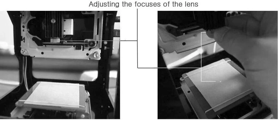We will use the gray cardboard to carve as an example to explain, please follow the instructions to do your operation. If you are working for the first time, you can ignore this step, because factory default settings the focal length of the gray cardboard, there is no need to do any adjustment. If you need to carve the object in different thickness, you need to place the object in the engraving platform and adjust the focus manually, when in the first operation, it is recommended to use a gray cardboard (in the package list) to carve; The method of adjust the focal length as follow: 1: Fixed the surface of the carved objects at the level of the bearing table, Pick up the focusing mirror ( sent in random, just to be used as focus),rotate the focus head manually, shown in figure: