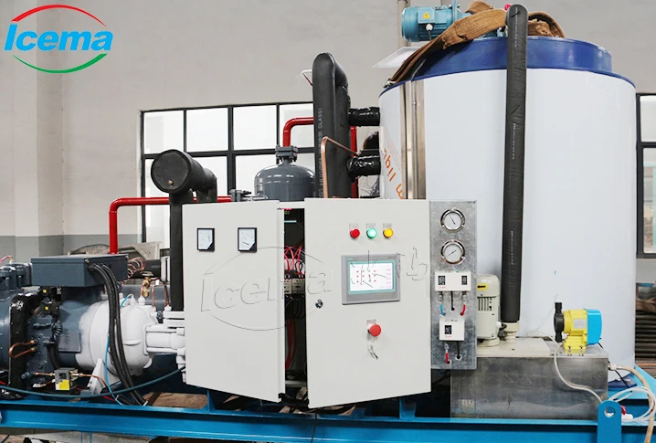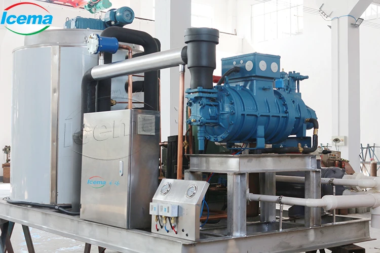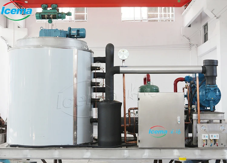 Icema flake ice machine working principle is the closed loop heat exchange of refrigerant.Outside water flow into the water tank, then pumped into the water distribution pan evenly flows down the inner wall of evaporator. The refrigerant in the refrigeration system evaporates through the loop inside the evaporator and absorbs large amount of heat by exchanging heat with the water on the wall.As the result, the water flow over the surface of inner evaporator wall sharply cools down to below the freezing point and freezes into ice instantaneously.When the ice on the inner wall reaches a certain thickness,spiral ice blade driven by reducer cut the ice to piece.Thus ice flake forms and falls into the ice storage bin under ice machine,stocking for using.The water not turning into ice will drop in the water baffle at the bottom of evaporator and flow into the water tank for recycling.