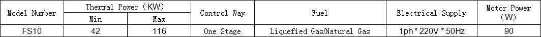 After single stage gas burner is ignited, only one stage heating power works, which cannot be adjusted. The heating power of four models ranges from 42kw to 116KW.