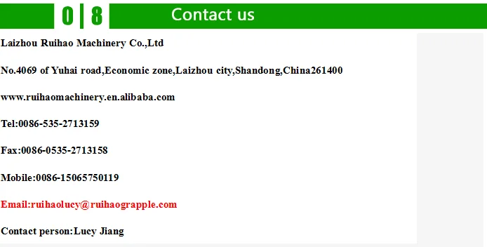 Laizhou Ruihao Machinery Co., Ltd. is located in Laizhou, Shandong Province, China, which was established in the year of 2010. We are a specialized manufacturer of forestry and agricultural implements or attachments, such as log grapple, felling grapple, hydraulic rotators, tractor log skidder, grapple bucket, etc. . Also, we can offer OEM service. With the good test equipment, 100% of products are well exported for worldwide, like France, Germany, Canada, Sweden, Australia and Bulgaria