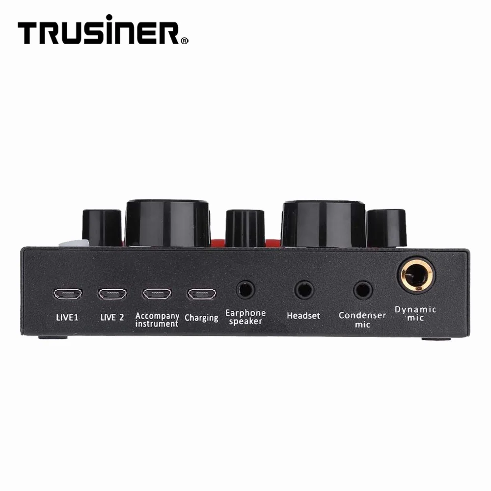 | Sound card function: | 12 kinds of electronic sound, 12 kinds of sound effects, 6 effect modes, reverb volume adjustment,microphone volume adjustment, high and low sound adjustment,recording volume adjustment, volume adjustment, monitor volume adjustment (ie earplug) return function). Support the use of mobile computers, support a single headset, 7 kinds of connections: single mobile phone Kara live, double mobile live, three mobile live, mobile computer live broadcast, single computer live, computer accompaniment mobile live,musical instrument input mobile live. |
