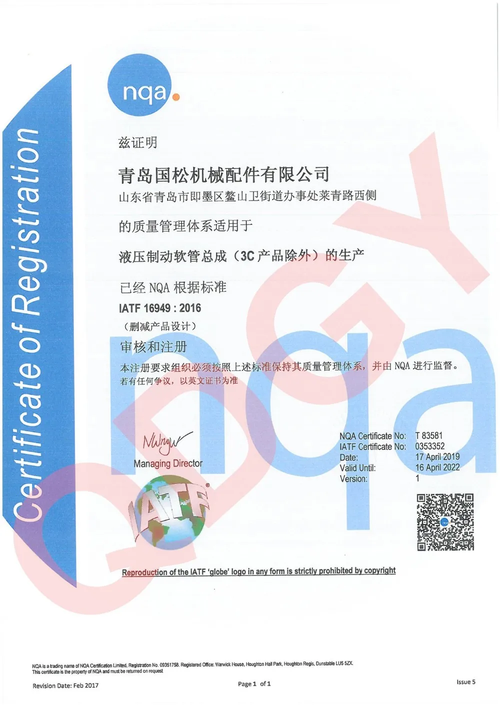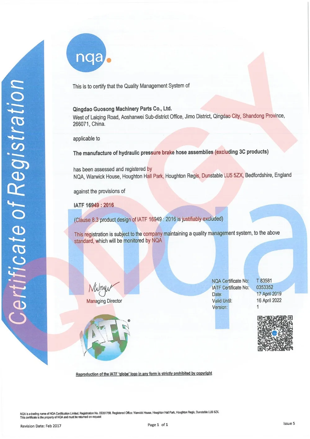 Qingdao Guosong Machinery Parts Co.,LTD. founded at 1998, the Co. has been expanded to the leading brake hose manufacturer in China now. It has more than 300 staff, buildings occupying area about 6,000 square meters . The sections include Marketing Department, Hose Factory and Fitting Factory.