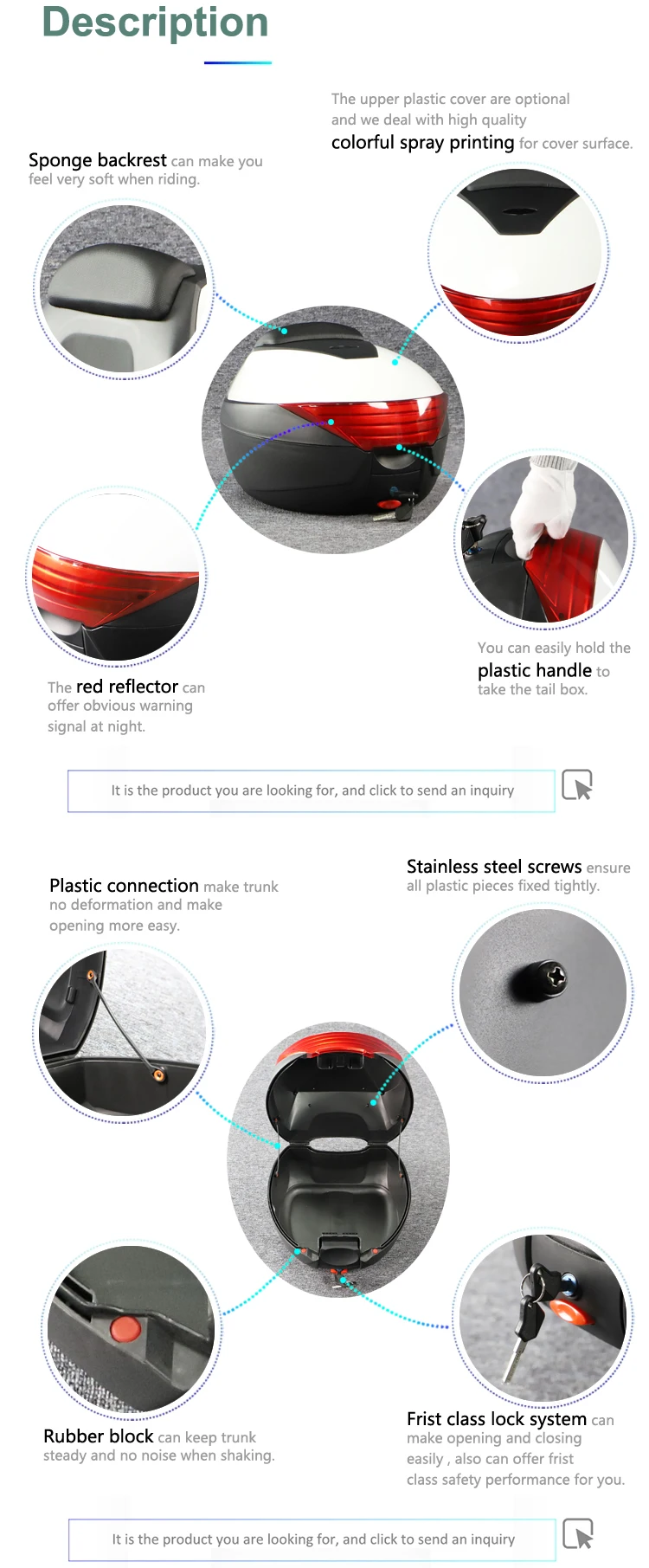 | OEM: | Custom service and OEM orders are welcomed at any time; | Product name: | Motorcycle tail box; |