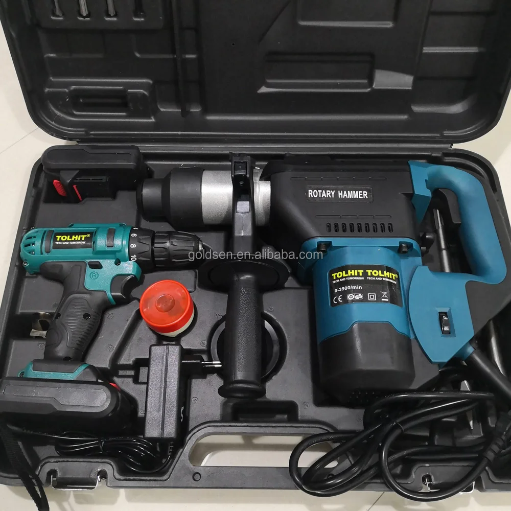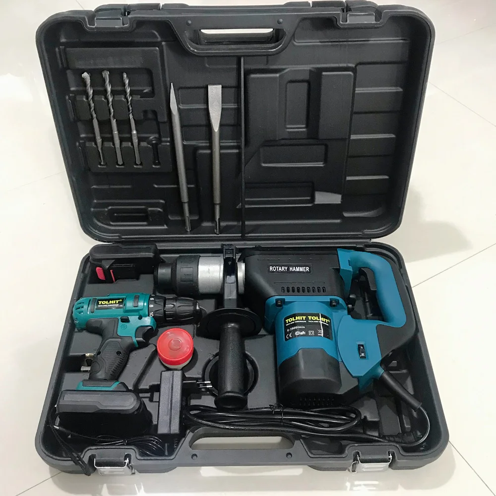 TOLHIT 32mm 900w Electric Rotary Hammer Machine 21v lithium Battery Powered Impact Cordless Drill Power Tools Combo Set for drilling concrete, steel, wood and more usage.