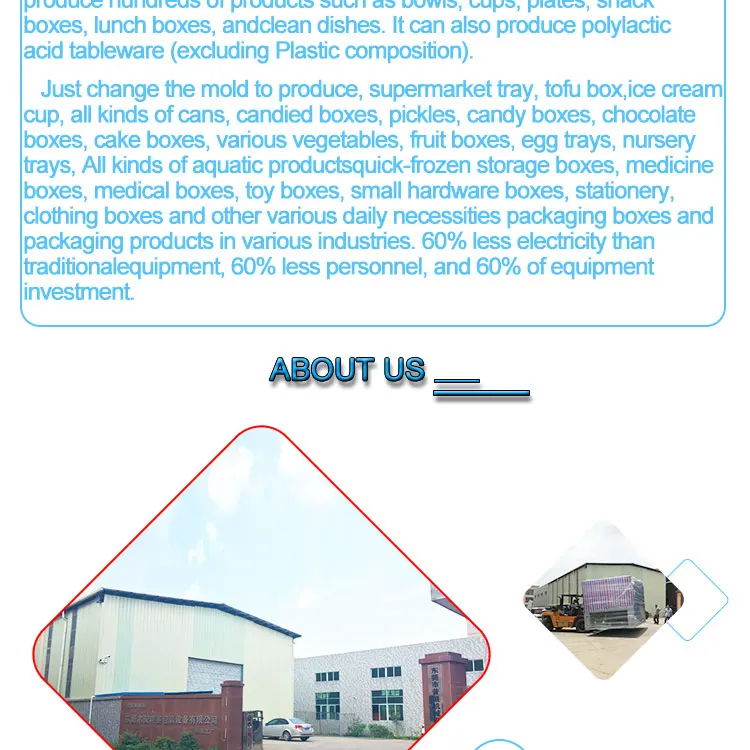 | Applicable Industries: | Hotels,Garment Shops,Building Material Shops,Manufacturing Plant,Machinery Repair Shops,Food & Beverage Factory,Farms,Restaurant,Home Use,Retail,Food Shop,Printing Shops,Construction works ,Energy & Mining,Food & Beverage Shops,Advertising Company; | Package Type: | The machine is packed in fumigation wooden box, wrapped with plastic film & tarpaulin, loaded in 40HQ or 40FR. High speed automatic plastic thermoforming machine with stacker.; |